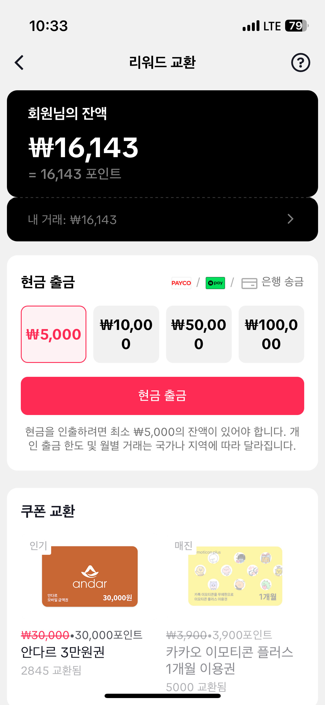 저의 경우 16000포인트가 적립된 상태였습니다. 출금 가능한 최소 금액은 5000포인트이므로 이 조건을 충족해야 합니다.