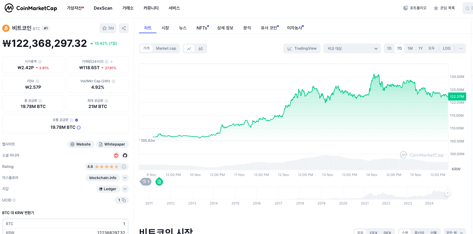 “트럼프 랠리 끝났나” 비트코인, 2% 하락…1억2400만원대