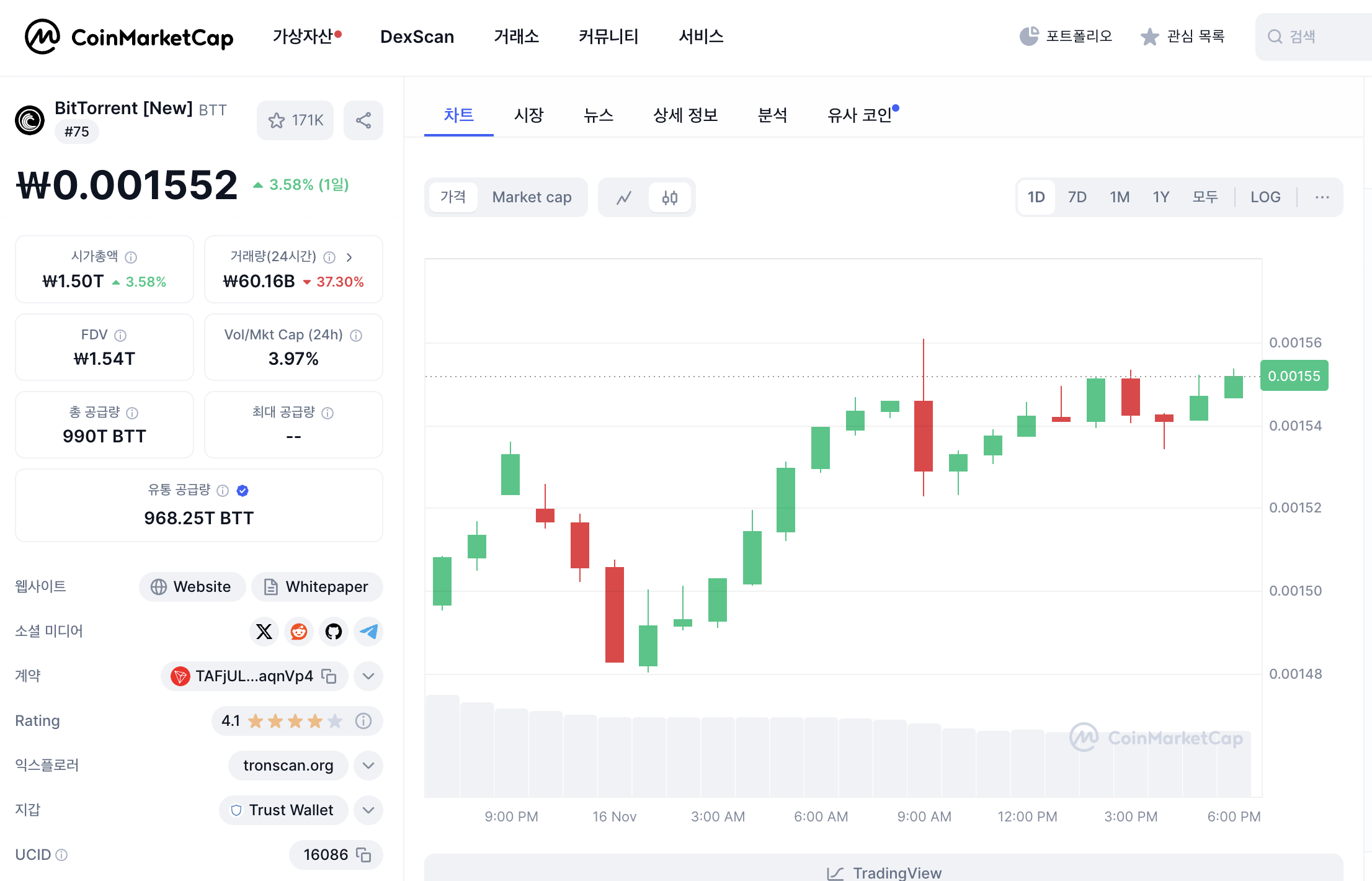 - 유통 공급량: 968.25조 BTTC