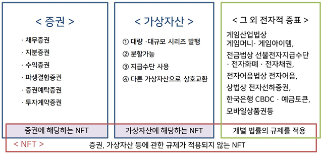 - 가상자산여부 검토: NFT가 증권에 해당되지 않는 경우, 가상자산이용자보호법 상 가상자산에 해당되는지 여부를 따져야 합니다.