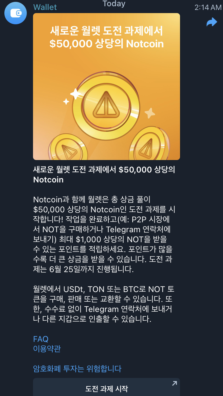 텔레그램 wallet에서 Not Coin 이벤트를 진행중입니다.