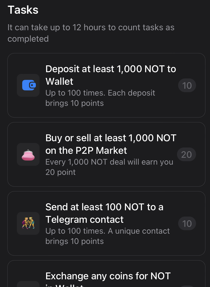 Notcoin과 함께 월렛은 총 상금 풀이 $50,000 상당의 Notcoin인 도전 과제를 시작합니다! 작업을 완료하고(예: P2P 시장에서 NOT을 구매하거나 Telegram 연락처에 보내기) 최대 $1,000 상당의 NOT을 받을 수 있는 포인트를 적립하세요. 포인트가 많을수록 더 큰 상금을 받을 수 있습니다. 도전 과제는 6월 25일까지 진행됩니다.
